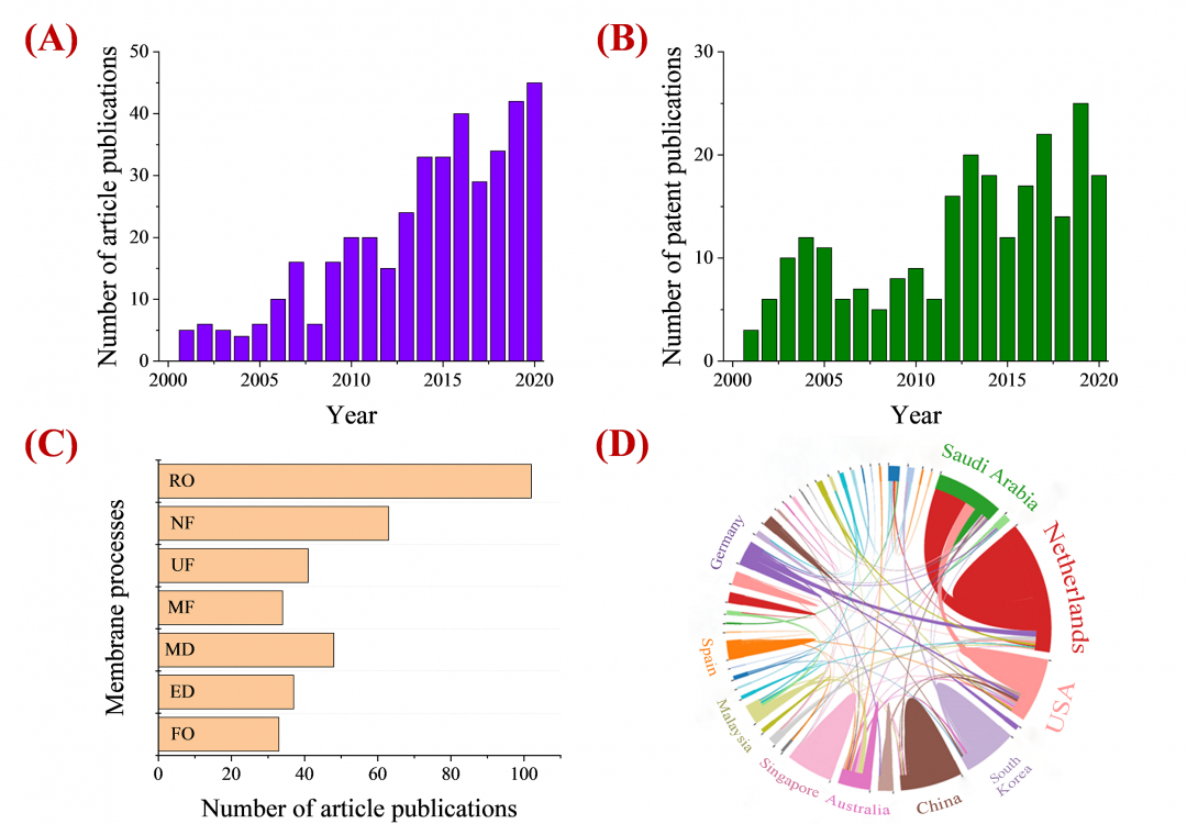 圖2 基于Web of Science獲取的主題為“ feed spacer”和“ membrane”、時(shí)間跨度為2001——2020年的文獻(xiàn)計(jì)量學(xué)結(jié)果。(A)每年相關(guān)文章發(fā)表情況;(B)每年相關(guān)專(zhuān)利授權(quán)情況;(C)發(fā)表文章中所涉及的膜工藝種類(lèi)分布;(D)主要發(fā)文國(guó)家及其合作關(guān)系。