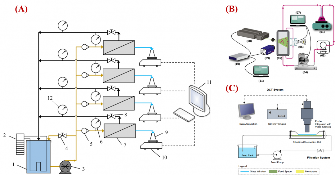 本文首先總結(jié)了該領(lǐng)域常用的研究方法,包括水力學(xué)實(shí)驗(yàn)、膜污染實(shí)驗(yàn)和計(jì)算流體力學(xué)(CFD)模擬。水力學(xué)實(shí)驗(yàn)和膜污染實(shí)驗(yàn)主要采用錯(cuò)流過(guò)濾裝置(圖4A),且保證進(jìn)水隔網(wǎng)與膜面緊貼,以更好地模擬流體在卷式膜組件中的行為。流道壓降差(FCP drop)是衡量進(jìn)水隔網(wǎng)性能的重要參數(shù),也是水力學(xué)實(shí)驗(yàn)主要的測(cè)試指標(biāo)之一,對(duì)其的測(cè)量也從最初的U型管到如今的高精度壓差傳感器。膜污染實(shí)驗(yàn)主要指生物污染實(shí)驗(yàn),近些年研究者們開(kāi)始更多關(guān)注流道內(nèi)生物污染的動(dòng)態(tài)發(fā)展過(guò)程,這得益于實(shí)時(shí)原位觀測(cè)技術(shù)的發(fā)展,如PIV(圖4B)、OCT(圖4C)、NMR等,其中NMR已可以被運(yùn)用于工業(yè)級(jí)別的卷式膜組件中流態(tài)和膜污染的實(shí)時(shí)原位觀測(cè)。CFD模擬也歷經(jīng)了從早期的簡(jiǎn)單流態(tài)模擬,到后來(lái)耦合了傳質(zhì)、無(wú)機(jī)污染甚至生物污染的復(fù)雜模型的變化,模型的驗(yàn)證主要通過(guò)流道壓降差的測(cè)定或和原位觀測(cè)的流場(chǎng)進(jìn)行比對(duì)來(lái)完成。