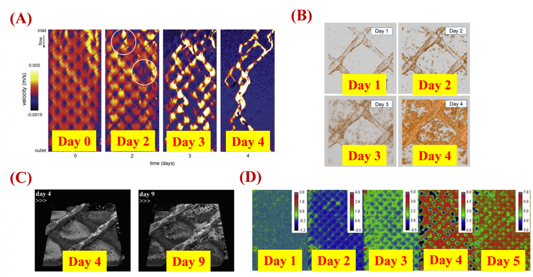 圖6 生物膜在流道內(nèi)的動(dòng)態(tài)發(fā)展過(guò)程。(A)NMR速度成像,黑色區(qū)域指示生物膜的積累(Vrouwenvelder et al.,2009);(B)&(C)OCT 觀測(cè)(West et al.,2016; Fortunato et al.,2017);(D)氧氣濃度下降速率指示生物污染分布(Farhat et al.,2015)。