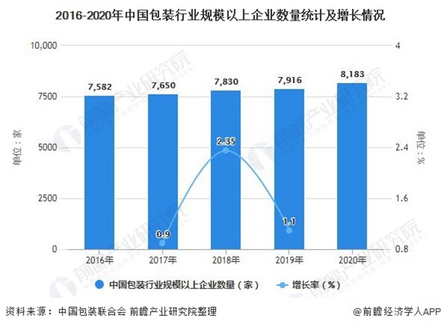 根據(jù)中國(guó)包裝聯(lián)合會(huì)統(tǒng)計(jì)數(shù)據(jù)顯示,2016-2019年,我國(guó)包裝行業(yè)規(guī)模以上企業(yè)數(shù)量(年主營(yíng)業(yè)務(wù)收入2000萬(wàn)元及以上全部工業(yè)法人企業(yè))呈穩(wěn)步上升的趨勢(shì)。2019年中國(guó)包裝行業(yè)規(guī)模以上企業(yè)數(shù)量達(dá)7916家,同比增長(zhǎng)1.10%。截止至2020年中國(guó)包裝行業(yè)規(guī)模以上企業(yè)數(shù)量達(dá)到8183家,企業(yè)數(shù)比去年增加267家。反映出行業(yè)入局者逐漸增多,市場(chǎng)競(jìng)爭(zhēng)日益激烈。