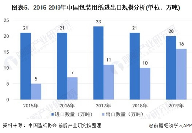 根據(jù)中國(guó)造紙協(xié)會(huì)資料,2015-2019年中國(guó)包裝用紙進(jìn)口數(shù)量較為穩(wěn)定,保持在20-23萬(wàn)噸之間,出口數(shù)量逐年上升,貿(mào)易逆差逐漸縮小,到2019年中國(guó)包裝用紙進(jìn)口數(shù)量為20萬(wàn)噸,出口規(guī)模為16萬(wàn)噸。