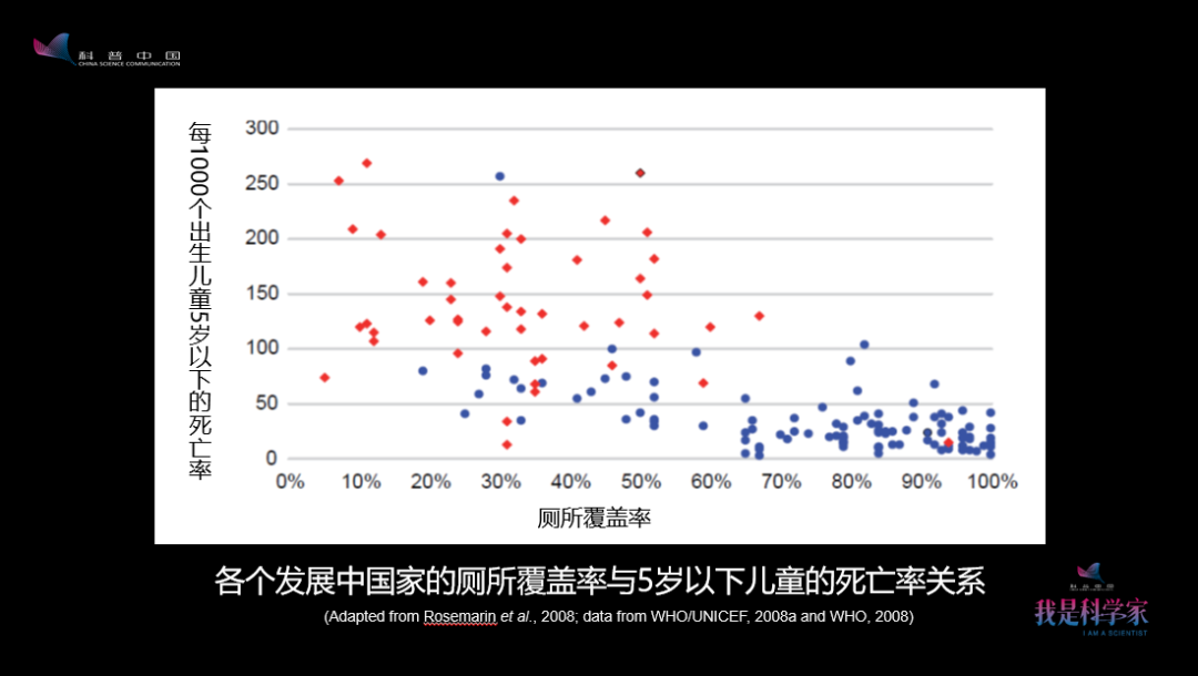 圖中最左邊的1000個兒童,5歲以下的死亡人數(shù)高達近300個,但如果是到了100%有衛(wèi)生廁所的這邊,死亡人數(shù)幾乎就是0了。這是用大數(shù)據(jù)證明了廁所和人類健康的關系——衛(wèi)生廁所的數(shù)量越多,兒童的死亡率越低。