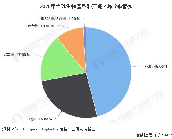 從產能的區(qū)域分布來看,2020年,全球生物基塑料產能主要分布在亞洲,產能占比達46%,同時,European Bioplastics預測該地區(qū)將在未來五年內繼續(xù)成為主要的生產中心;全球第二大生產基地分布在歐洲,其產能約占全球生物塑料產能的四分之一。