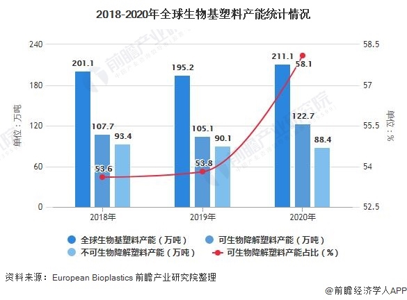 據(jù)European Bioplastics(歐洲生物塑料協(xié)會)于發(fā)布的最新數(shù)據(jù)顯示,全球生物基塑料約占每年生產的塑料中的1%。2020年,全球生物基塑料產能達211.1萬噸,其中可生物降解塑料的產能為122.7萬噸,不可生物降解產能為88.4萬噸。