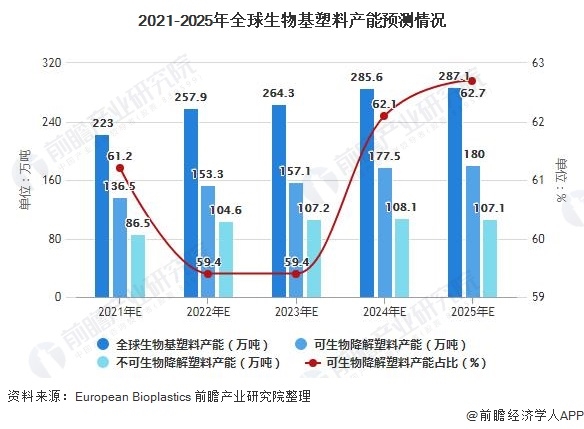 未來隨著生物基塑料需求的增長,以及越來越多生物基聚合物、應用和產品的出現(xiàn),生物基塑料產能仍將保持不斷增長。據(jù)歐洲生物塑料協(xié)會預測,至2025年,全球生物基塑料產能將突破287萬噸,其中,可降解生物基塑料的產能占比也將提升至60%以上。