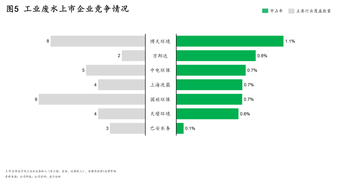 我國工業(yè)廢水上游行業(yè)相當(dāng)分散,即使是運(yùn)營規(guī)模最大的化工行業(yè),其占比也只有18%(如圖4)。