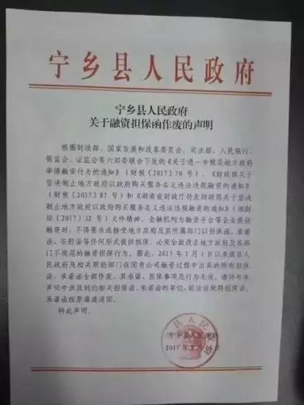 8月23日,網(wǎng)傳寧鄉(xiāng)縣政府融資擔(dān)保函作廢的聲明