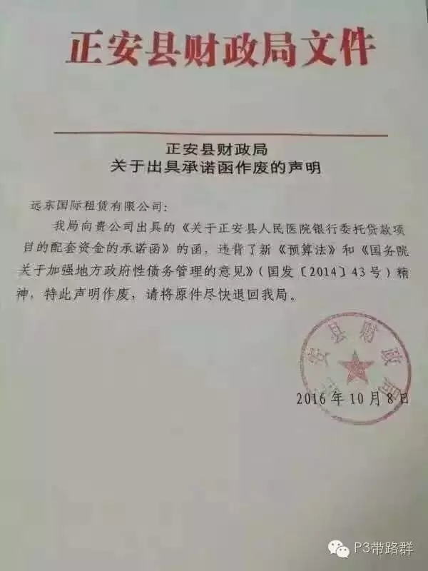 在地方債務(wù)“嚴(yán)監(jiān)管”常態(tài)化以及此番地方政府舉債融資“史上最嚴(yán)大排查”收官在即的大背景下,地方政府迫于監(jiān)管壓力,撤回融資擔(dān)保承諾函的事件可謂屢見不鮮,其中涉及租賃公司的有:2016年10月,貴州省多個地市級財(cái)政局就曾密集申明承諾函作廢并要求限時退回原件。事件涉及正安、安順、遵義三市區(qū)財(cái)政局,并將國泰租賃、遠(yuǎn)東國際租賃和中信信托卷入其中。