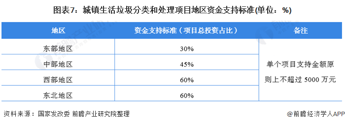 資金支持標(biāo)準(zhǔn)中有城鎮(zhèn)生活垃圾分類和處理項(xiàng)目,按東、中、西和東北地區(qū)分別不超過(guò)項(xiàng)目總投資的30%、45%、60%、60%控制,單個(gè)項(xiàng)目支持金額原則上不超過(guò)5000萬(wàn)元,重大創(chuàng)新示范項(xiàng)目除外。