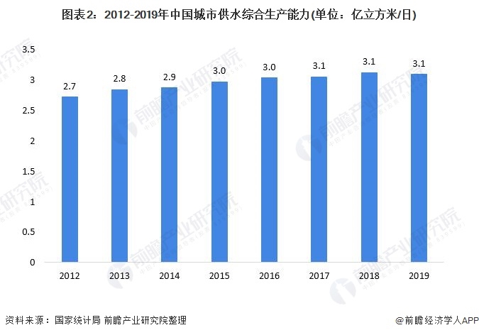 隨著我國城市用水人口穩(wěn)健,我國城市供水能力也持續(xù)提高。2012-2018年我國城市供水綜合生產(chǎn)能力持續(xù)上升,2019年有所下降,為3.09億立方米/日,較2018年下降1.04%。