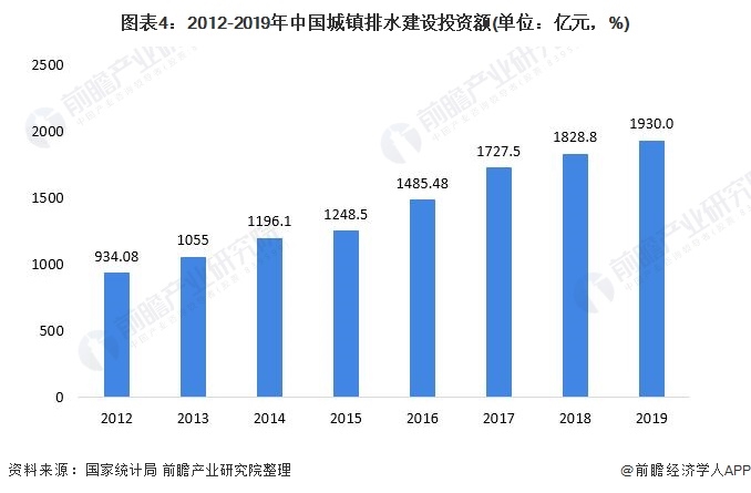 在《城市排水防澇設施建設中央預算內(nèi)投資專項管理暫行辦法》等排水投資政策的推動下,我國水務投資持續(xù)加碼,自2013年起我國城鎮(zhèn)排水建設投資額每年快速增長,2012尚且為934.08億元,到2017年就已達到1727.52億元,增長了近一倍,2019年投資額達1930.02億元。
