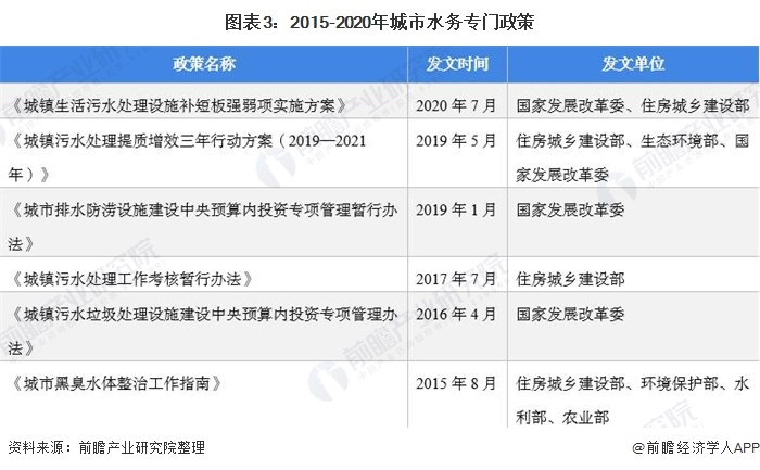 隨著城市用水人口的增長,我國城市水務面臨較大的供給壓力,因此國家十分注重城市水務的發(fā)展,近年來發(fā)布了一系列相關(guān)政策,特別是污水治理方面。其中《城鎮(zhèn)污水處理提質(zhì)增效三年行動方案(2019—2021年)》指出,目標經(jīng)過3年努力,地級及以上城市建成區(qū)基本無生活污水直排口,基本消除城中村、老舊城區(qū)和城鄉(xiāng)結(jié)合部生活污水收集處理設施空白區(qū),基本消除黑臭水體,城市生活污水集中收集效能顯著提高。