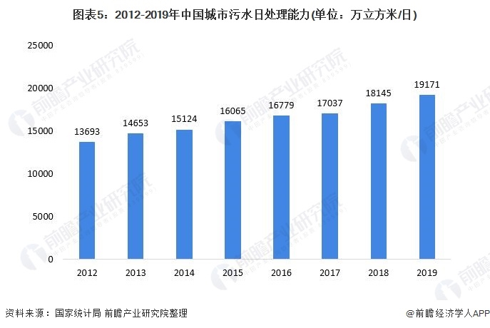 隨著國家政策的持續(xù)發(fā)力、水務投資的持續(xù)加碼,我國城市污水日處理能力逐步加強,從2012年的13693萬立方米/日穩(wěn)步增長至2019年的19171萬立方米/日。