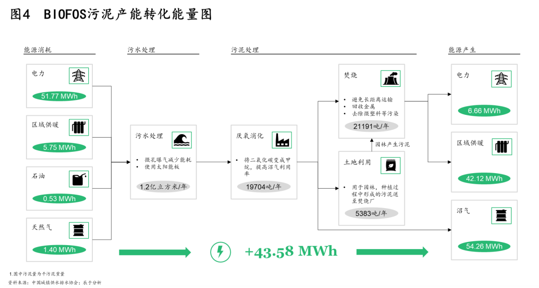 其二,30●60雙碳目標(biāo)提出后,未來污泥處理處置將以節(jié)能降耗及能源資源回收為目標(biāo),這對污泥處理提出了更為清晰的技術(shù)路徑方向。例如在能源回收上,厭氧消化是優(yōu)選途徑,如丹麥污水廠BIOFOS通過污泥消化產(chǎn)能實現(xiàn)能量盈余(見圖4)。
