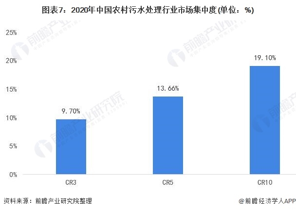 總體來看,我國農(nóng)村污水處理行業(yè)的市場集中度較低,2020年我國農(nóng)村污水處理行業(yè)CR3為9.7%;CR5為13.66%;CR10為19.10%。