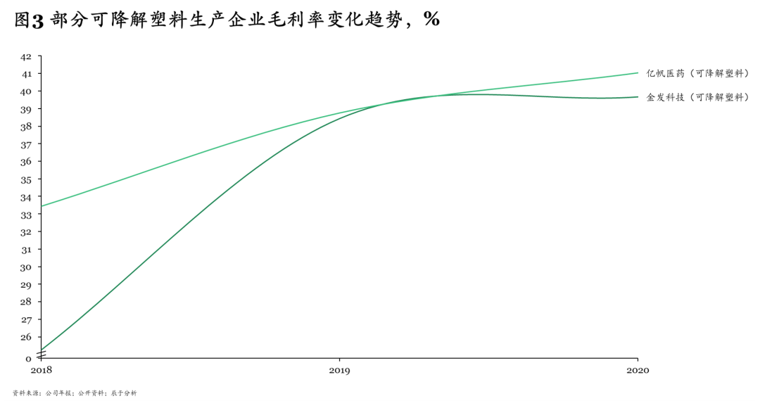 與此同時,可降解塑料產(chǎn)品價格近一年來攀升,例如禁塑令前PLA價格為2萬元/噸,現(xiàn)在一些地方的市場價已高達5萬元/噸。這直接提升了行業(yè)整體盈利水平,例如金發(fā)科技、億帆醫(yī)藥等龍頭企業(yè)2019、2020年的毛利率均接近40%,相比2018年大幅提升(見圖3)。