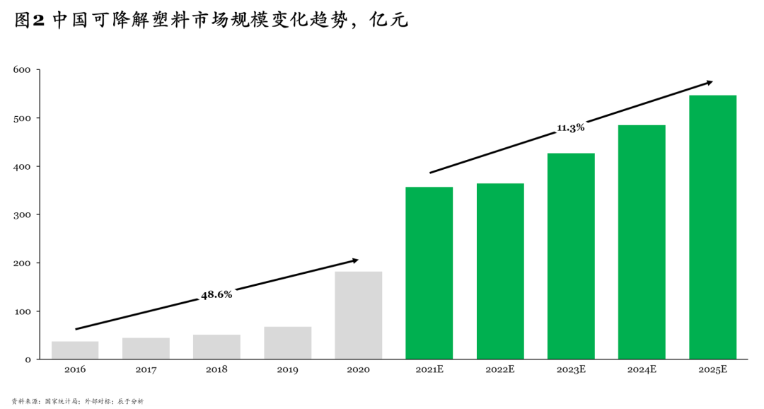 受此影響,作為傳統(tǒng)塑料替代產(chǎn)品的可降解塑料市場大幅度增長,訂單暴增,我們預計“十四五”期間,可降解塑料市場將以11.3%的年復合增速,到2025年實現(xiàn)500億元以上的收入規(guī)模(見圖2)。