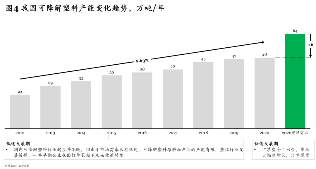 由于早前市場長期低迷,國內(nèi)可降解塑料的產(chǎn)能增速一直較慢,據(jù)統(tǒng)計, 2012~2020年間,這一數(shù)字的年復合增長率為9.63%,到2020年達到48萬噸/年,同年的市場需求則為64萬噸/年,產(chǎn)能缺口較大(見圖4)。