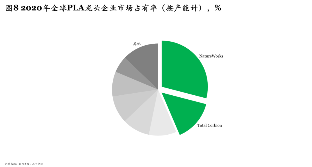 原料價格高、技術(shù)水平較低、產(chǎn)能利用率較低,是導致我國可降解塑料價格居高不下的三大主因。以PLA為例,一步法雖然成本低但品質(zhì)差,二步法品質(zhì)優(yōu),是目前主流合成路線,但成本高,是一步法的2.3倍左右。如何實現(xiàn)高純度、低成本是提升滲透率、贏得市場競爭的關(guān)鍵:例如美國NatureWorks、法國 Total 和荷蘭 Corbion 的合建公司Total Corbion由于擁有PLA制備中間體—丙交酯的低成本高純度制備工藝而引領(lǐng)全球市場,2020年的產(chǎn)能占有率分別達到29.04%和14.52%(圖8)。