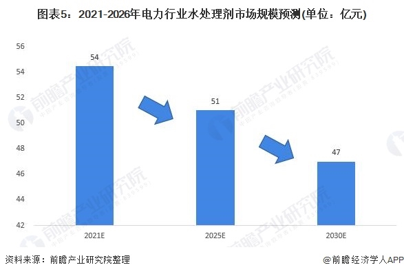 因此,在水處理劑使用方面,由于煤炭資源和水資源呈逆向分布特點,45%的火電廠裝機建于“過度取水”區(qū),火力發(fā)電用水占全國工業(yè)用水總量的30%-40%,其中循環(huán)冷卻水用量占比70%以上,未來隨著國家節(jié)能減排和清潔能源的使用的加大,整體發(fā)電量增速放緩,火電發(fā)電的使用份額進一步下降,電力水處理劑有望隨之整體下降,預(yù)計到2025年市場規(guī)?;?qū)⑾陆抵?1億元左右,到2030年下降至47億元。