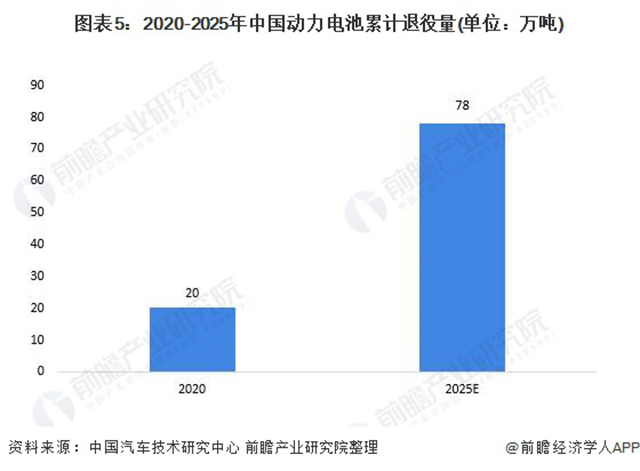 各企業(yè)布局動(dòng)力電池回收的另一原因是動(dòng)力電池回收市場規(guī)模龐大。作為全球新能源汽車、動(dòng)力電池第一大國,我國退役電池量是十分龐大的。據(jù)中國汽車技術(shù)研究中心公布數(shù)據(jù),2020年我國動(dòng)力電池累計(jì)退役量約20萬噸,2025年累計(jì)退役量約為78萬噸。