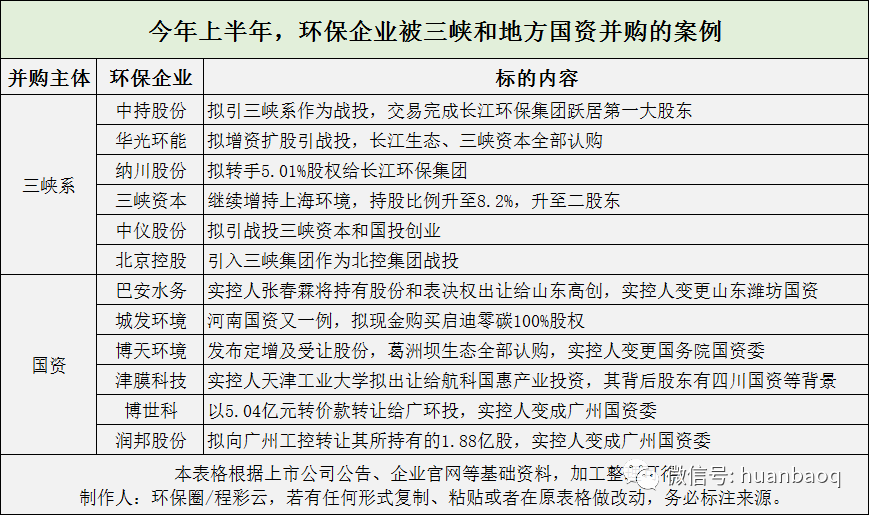 圖二:今年前6月環(huán)保行業(yè)收并購案例數(shù)交易資金排名前三的都是環(huán)保上市企業(yè)并購分別是:中國天楹欲115億元出售海外資金,通用首創(chuàng)50.84億元轉(zhuǎn)讓持有的40%深水集團(tuán)股權(quán),以及云南水務(wù)欲以21億元將持有的浙江海云環(huán)保、首創(chuàng)水務(wù)等部分股權(quán)轉(zhuǎn)讓給錢江生化。(如圖三所示)圖三:今年上半年環(huán)保企業(yè)并購資金排行半年的交易量,就幾乎趕上2015年-2017年,每年全年400億元的交易額了,而且頭部龍頭企業(yè)兼并重組在今年上半年愈發(fā)猛烈。拋開5月14日世界級環(huán)保巨頭威立雅和蘇伊士的合并不說,經(jīng)過此輪殘酷的“你死我活”,我國環(huán)保產(chǎn)業(yè)已經(jīng)初步形成了以三峽、中節(jié)能等大央企和地方國資為首的“兩大幫派”的局面。稍加分類就會發(fā)現(xiàn),上半年39起并購案例,有12起,約1/3都跟三峽系和各省地方國資有關(guān),大抵也是這波“混改”潮的延續(xù)。(如圖四所示)其實(shí),仔細(xì)推算,形成“大央企和地方國資為主,中小型技術(shù)裝備民企為輔”的局面,也只不過短短5-6年時(shí)間而已。回想起來,6年前,在素有“環(huán)保政策元年”之稱的2015年,也就是“十三五”的開局之年,環(huán)保行業(yè)才剛剛開始爆發(fā)。當(dāng)時(shí)正值環(huán)保利好政策大爆發(fā),“水十條”、“氣十條”、“土十條”、PPP等相關(guān)領(lǐng)域的政策接踵而至。各方勢力也是高舉高打,紛紛進(jìn)入環(huán)保行業(yè),裹挾大批資金的中字頭央企、環(huán)保頭部企業(yè)以及中等規(guī)模上市民企都紛紛擼起袖子,加快搶灘國內(nèi)外環(huán)保市場。由三方勢力攪動“并購”潮,一路買買買,致使當(dāng)年環(huán)保并購案例高達(dá)136起,涉及400億元的交易金額。雖說400億元的交易資金相對于今年還不算很高,但是從并購主角、標(biāo)的內(nèi)容以及并購目的來看,就已經(jīng)能夠明顯感覺到,我國環(huán)保產(chǎn)業(yè)開始發(fā)生翻天覆地的變化了。第一,從“買買買”到“賣賣賣”,背后折射競爭格局更迭。從并購的主角,買賣雙方來看,近兩年,不少明星環(huán)保上市民企,曾經(jīng)的市場“主角”,如今都淪為大央企、地方國資收割的對象,如啟迪環(huán)境、博天環(huán)境、巴安水務(wù)、津膜科技、博世科等。曾幾何時(shí),這些環(huán)保企業(yè)也是并購的主角,輝煌時(shí)斥巨資買下諸多中小企業(yè),甚至喊出百億千億市值的目標(biāo),上演“蛇吞象”;但最終還是時(shí)運(yùn)不濟(jì),資金短缺,債務(wù)高企,現(xiàn)金流告急,不得不將曾經(jīng)并購的資產(chǎn)統(tǒng)統(tǒng)甩賣,祈求活下去。一是發(fā)生在2015年的清華控股、啟迪科服戰(zhàn)略并購桑德環(huán)境案,70億元的并購資金也直接刷新了當(dāng)時(shí)的行業(yè)記錄,被稱為改革開放以來中國環(huán)境領(lǐng)域最大的一筆并購。之后幾年,這樁并購案也是幾經(jīng)波折,先是2019年啟迪與桑德“分家”,文一波辭去啟迪桑德董事長職務(wù),完成“去桑德化”;然后發(fā)展越來越慢的啟迪環(huán)境項(xiàng)目幾度停工,陷入債務(wù)危機(jī),不得不拋售相關(guān)資產(chǎn)緩解危機(jī);在與雄安集團(tuán)、三峽、合肥建投“談崩”后,最終在6月3日,與河南國資城發(fā)環(huán)境結(jié)成聯(lián)姻。二是買來海外資產(chǎn)Urbaser僅3年,近期又想高價(jià)賣出的中國天楹。按照中國天楹的說法,轉(zhuǎn)讓Urbaser控制權(quán),主要是扭轉(zhuǎn)公司現(xiàn)金流不足,降低資產(chǎn)負(fù)債率以及商譽(yù)減持的需要。看樣子,對于中國天楹這條“地方蛇”,要想吞并Urbaser這頭“國際大象”還是有點(diǎn)費(fèi)勁的,胃口大了,容易消化不良。從“買買買”到“賣賣賣”,表面上看是一場商業(yè)游戲,背后折射的則是市場競爭格局的變化更迭,環(huán)保行業(yè)競爭日漸激烈的趨勢,以及細(xì)分領(lǐng)域增量產(chǎn)業(yè)的萎縮。比如中持在引入長江環(huán)保集團(tuán)作為戰(zhàn)投時(shí),就曾談到行業(yè)大背景變幻帶來的隱憂。“面對城市業(yè)務(wù)增量的萎縮以及市場競爭加劇,都會公司水務(wù)業(yè)務(wù)造成一定的影響,而且公司在城鎮(zhèn)污水處理、工業(yè)園區(qū)和工業(yè)污水處理等每個(gè)細(xì)分領(lǐng)域,競爭都很激烈,為了進(jìn)一步提升實(shí)力,開拓新的利潤增長點(diǎn),混改是戰(zhàn)略考量。”中持表示。第二,從奪權(quán)到無實(shí)控人,“混改”模式日漸科學(xué)?對于這波大央企、地方國資拋來的“橄欖枝”,不少環(huán)保企業(yè)又愛又怕。一方面,他們既對國資進(jìn)入表示羨慕,希望借助其資金、政府關(guān)系、渠道、品牌壯大自己;另一方面,又流露出對“混改”后引入國企管理制度的憂慮,怕“被管死”。市場上也的確存在不少民營企業(yè)被國資并購后,由于實(shí)控人發(fā)生變更,使得原有人員不適應(yīng)新的國企管理體制,從而喪失市場活力的案例。