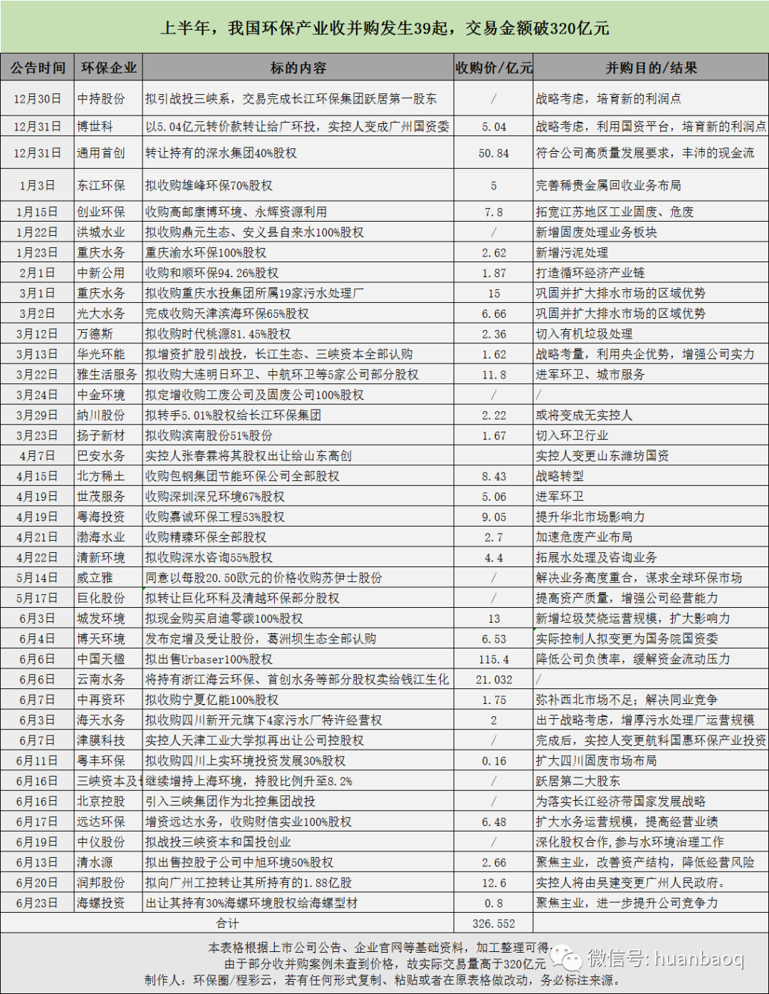 難道國資進(jìn)入,發(fā)生“混改”就一定會意味著原有民營企業(yè)經(jīng)營管理團(tuán)隊(duì)的重大調(diào)整,意味著新的企業(yè)會遭遇對國企嚴(yán)格管理制度的不適應(yīng),進(jìn)而導(dǎo)致企業(yè)喪失市場活力么?現(xiàn)在看來,中持股份與長江生態(tài)環(huán)保集團(tuán)的“無實(shí)控人”混改模式有可能給出不一樣的答案。但至于哪種模式更科學(xué),效果更好,目前還難以回答,為時(shí)尚早?;蛟S再過3年5年,時(shí)間會給出答案。遙想6年前,那時(shí)的環(huán)保行業(yè)非常熱鬧,不僅惹得圈內(nèi)環(huán)保企業(yè)一路“買買買”向構(gòu)建大環(huán)保平臺邁進(jìn),更有諸多圈外非環(huán)保企業(yè)跨界而來,被媒體戲稱為“野蠻人入侵”。2015年,是傳統(tǒng)行業(yè)跨界環(huán)保的元年,在看到環(huán)境產(chǎn)業(yè)成長紅利后,他們紛紛大手筆跨界,落子環(huán)境產(chǎn)業(yè)。據(jù)媒體不完全統(tǒng)計(jì),當(dāng)年環(huán)保領(lǐng)域至少新添了40張新面孔,其中不乏葛洲壩集團(tuán)、中國石化、中信集團(tuán)、中國中車、中國中鐵這樣的大型國企。2016年則是跨界布局環(huán)境產(chǎn)業(yè)的爆發(fā)期,在這一年間,許多實(shí)力強(qiáng)勁的企業(yè)紛紛跨界環(huán)保,業(yè)內(nèi)一片嘩然,有人認(rèn)為他們進(jìn)入是好事,給環(huán)保行業(yè)帶來大量資金,也有人認(rèn)為他們會進(jìn)一步擠壓環(huán)保企業(yè)利潤,未來廝殺會越演愈烈。還有人認(rèn)為,入場者眾,出局者亦增多,未來五年才是環(huán)保并購的驗(yàn)證期,那些盲目入場、沒有技術(shù)和資本能力的企業(yè)將在“大洗牌”中出局。果然,狂歡只是暫時(shí)的,而危險(xiǎn)則隨之而來。到了2018年,跨界環(huán)境產(chǎn)業(yè)的并購僅有6起,外界資本對環(huán)境投資愈發(fā)理性和謹(jǐn)慎,絕大多數(shù)并購都是環(huán)保同行之間的兼并,橫向產(chǎn)業(yè)鏈下上游并購多發(fā)。從標(biāo)的來看,相對2015年水務(wù)和流域治理,2018年危廢和環(huán)衛(wèi)則成為資本爭寵的標(biāo)的。到了今年上半年,在39起并購案例中,真正意義上的跨界并購僅有3起,一個(gè)是從事稀土深加工的內(nèi)蒙企業(yè)北方稀土以8.43億元價(jià)格,收購了包鋼集團(tuán)旗下的節(jié)能環(huán)保公司全部股權(quán),謀求轉(zhuǎn)型;另一個(gè)是生產(chǎn)建筑板材企業(yè)揚(yáng)子新材以自有資金收購濱南股權(quán)51%股份,切入環(huán)衛(wèi),瞄準(zhǔn)城市公共服務(wù)。還有一個(gè),就是開篇提到的主業(yè)做生物殺蟲劑的錢江生化,并購云南水務(wù)旗下的污水處理廠運(yùn)營權(quán)。第四,海外并購降至冰點(diǎn),出海淘金熱已褪。隨著外界資本跨界環(huán)保熱情減退,近兩年海外并購也在逐年降溫,降至冰點(diǎn)以下。前幾年,在國家“一帶一路”戰(zhàn)略下,環(huán)保頭部企業(yè)為了快速補(bǔ)齊技術(shù)、服務(wù)運(yùn)營的短板,曾經(jīng)掀起一個(gè)出?!疤越稹钡臒岢?。北控、首創(chuàng)、中國天楹、錦江環(huán)境、云南水務(wù)、國禎環(huán)保、永清環(huán)保、格林美等優(yōu)秀環(huán)保上市企業(yè),都曾出于各種戰(zhàn)略考慮,尋求海外并購。其中北控曾在2016年斥資14.38億歐元(約125.48億港元),收購德國最大垃圾發(fā)電EEW全部股權(quán),成為中國對德最大并購交易。然而近兩年來,國內(nèi)環(huán)保龍頭企業(yè)則鮮有海外并購,即使有,也沒能掀起太大的浪花。據(jù)筆者觀察,今年上半年39起并購案例中,竟然沒有一例是龍頭環(huán)保企業(yè)出海并購國際友商,反倒是中國天楹拋售海外資產(chǎn),兩大法企威立雅和蘇伊士合并。從并購就能看出,兜兜轉(zhuǎn)轉(zhuǎn)不過幾年間,環(huán)保行業(yè)就已經(jīng)走了一波人,來了一撥人。行業(yè)格局正在發(fā)生巨變,一個(gè)新的時(shí)代已經(jīng)拉開大幕。附:上半年我國環(huán)保行業(yè)收并購案例詳情: