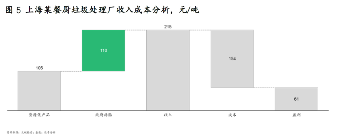 由于沼氣、粗油脂等資源化產(chǎn)物產(chǎn)量少、應(yīng)用有限,在當(dāng)前技術(shù)工藝下,餐廚垃圾處理的資源化價(jià)值很難獲得規(guī)模性與經(jīng)濟(jì)性,商業(yè)模式尚未完全走順暢。目前我國政府對餐廚垃圾企業(yè)實(shí)行運(yùn)行補(bǔ)貼和收運(yùn)補(bǔ)貼,具體金額大小受技術(shù)、地區(qū)、試點(diǎn)發(fā)展過程、項(xiàng)目處理量等因素影響。調(diào)研發(fā)現(xiàn),由于資源化產(chǎn)品盈利有限,難以覆蓋全部成本,餐廚垃圾處理企業(yè)的盈利當(dāng)前主要依靠政府補(bǔ)貼(見圖5)。