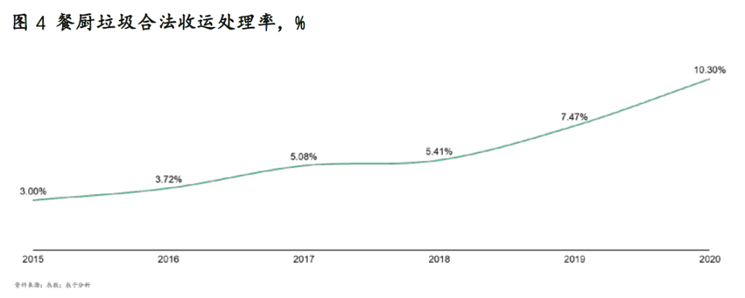 由于以上原因,我國餐廚垃圾回收并不完全。據(jù)統(tǒng)計(jì),盡管餐廚垃圾合法收運(yùn)處理率近5年持續(xù)上升,但目前也僅為10%左右(見圖4)。