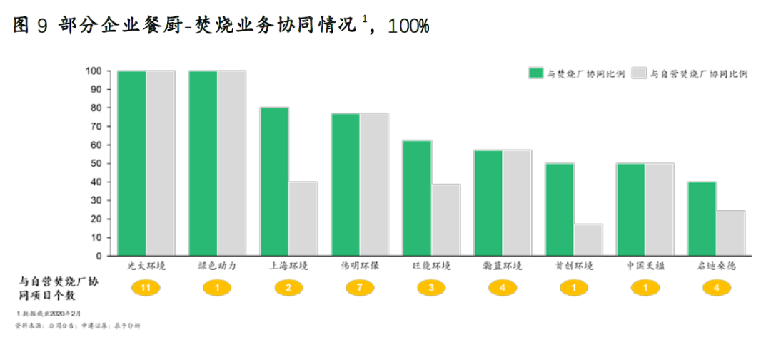 在垃圾分類全面推行的大背景下,這些大型固廢企業(yè)正利用協(xié)同優(yōu)勢降維打擊(見圖9)。一方面,垃圾焚燒主業(yè)帶給這些企業(yè)資金和政府資源雙重優(yōu)勢;另一方面,協(xié)同處置帶來降本增效,可以幫助這些企業(yè)降低財(cái)務(wù)壓力:在收入端,協(xié)同優(yōu)勢在于餐廚沼渣余電上網(wǎng);而在成本端,除可節(jié)約土建、人工等成本外,干濕垃圾處置的發(fā)電設(shè)備、除臭系統(tǒng)、滲濾液處理系統(tǒng)、蒸汽供熱系統(tǒng)等也可共用,從而降低折舊攤銷成本。