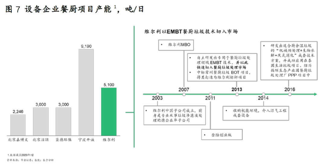 展望“十四五”,我們認(rèn)為有兩股力量不容忽視,餐廚垃圾處理行業(yè)真正激烈的市場競爭也許才剛剛開始,一方是以寧波開誠、維爾利為代表的企業(yè),他們進(jìn)入市場較早,主要提供技術(shù)或設(shè)備,同時(shí)具有一定的產(chǎn)能規(guī)模和先發(fā)品牌優(yōu)勢(見圖7)。