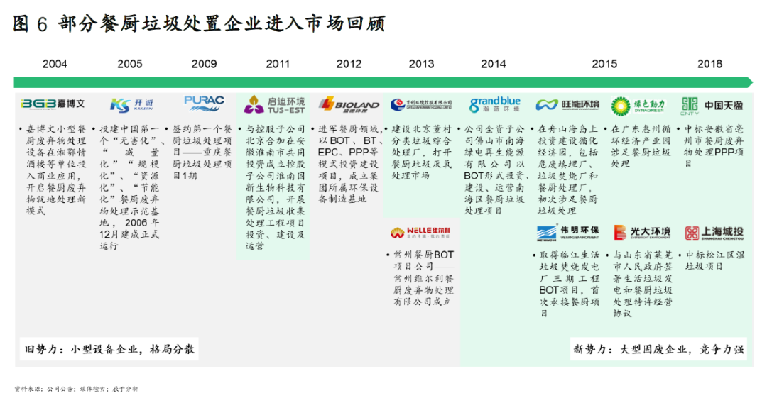回顧我國餐廚垃圾處理行業(yè)的發(fā)展歷程,可以看到過去十幾年由于市場規(guī)模小、發(fā)展慢,并未引起足夠重視,主要是一些小型設(shè)備企業(yè)“小打小鬧”,市場比較分散,競爭并不激烈。不過近幾年,隨著垃圾分類帶來的需求激增,包括光大環(huán)境、中國天楹、上海城投等大型固廢企業(yè)紛紛進(jìn)入,硝煙四起(見圖6)。