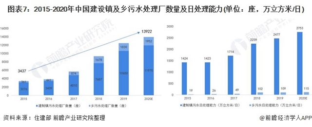 在國家政策的大力支持下,我國農(nóng)村污水廠數(shù)量飛速增長(zhǎng),污水處理能力穩(wěn)步提升,建設(shè)鎮(zhèn)及鄉(xiāng)污水處理廠數(shù)量由2015年的3437座增長(zhǎng)至2019年的12480座,增速高達(dá)三倍左右。2020年,我國農(nóng)村污水處理工程持續(xù)推進(jìn),前瞻初步估計(jì),截止2020年底,我國建設(shè)鎮(zhèn)及鄉(xiāng)污水處理廠數(shù)量分別達(dá)到了11970座和1952座;我國建設(shè)鎮(zhèn)及鄉(xiāng)污水日處理能力分別達(dá)到了2753萬立方米/日和115萬立方米/日。