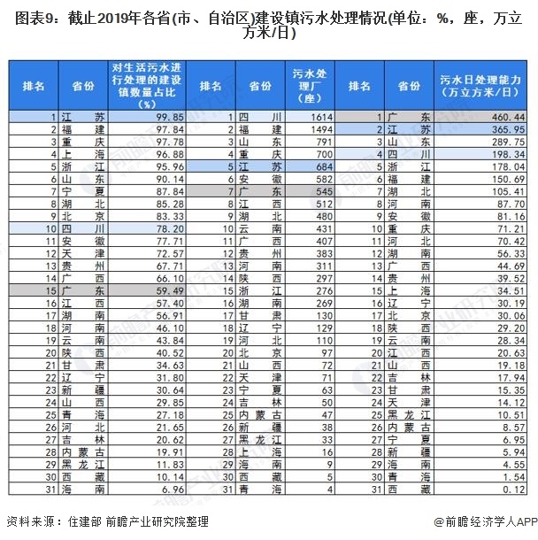 江蘇省內(nèi)對(duì)生活污水進(jìn)行處理的建設(shè)鎮(zhèn)數(shù)量占比最高,基本接近100%,上海市內(nèi)對(duì)生活污水進(jìn)行處理的鄉(xiāng)數(shù)量占比達(dá)到100%。而海南省內(nèi)對(duì)生活污水進(jìn)行處理的建設(shè)鎮(zhèn)和鄉(xiāng)數(shù)量占比最少,并且截至2019年底,海南目前并未有任何一個(gè)鄉(xiāng)對(duì)生活污水進(jìn)行處理。