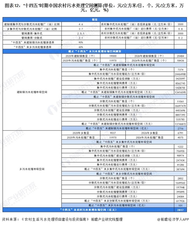 同時(shí)結(jié)合我國農(nóng)村居民整體居住較廣且分散的特點(diǎn),以及目前農(nóng)村污水處理滲透率、污水處理廠數(shù)量等情況,前瞻初步測(cè)算,截止“十四五”末,全國農(nóng)村污水處理市場(chǎng)空間約為2817億元。