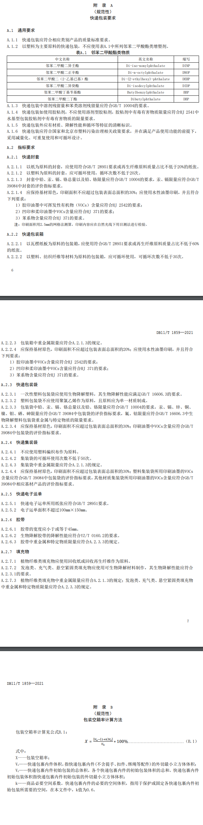 4.1.3 寄遞企業(yè)應(yīng)選擇適宜尺寸的包裝,快遞包裝空箱率不超過(guò)20%,包裝空箱率的計(jì)算方法詳見(jiàn)附錄 B。