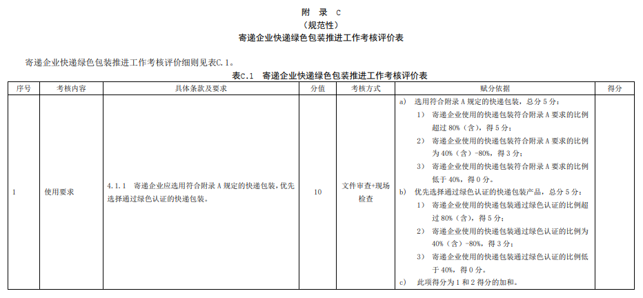 附錄C的考核評(píng)價(jià)表總分為100分,寄遞企業(yè)可依據(jù)賦分細(xì)則對(duì)每一條款進(jìn)行評(píng)分。