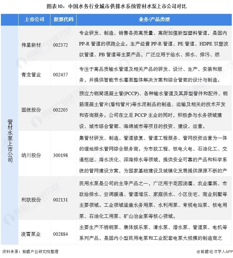 目前我國(guó)供排水管材水泵上市企業(yè)主要有偉星新材、青龍管業(yè)等管材上市公司;國(guó)統(tǒng)股份、納川股份等集管材和供排水建設(shè)的上市公司;利歐股份、凌霄泵業(yè)等水泵上市公司。其中,偉星新材是國(guó)內(nèi)PP-R管道的重點(diǎn)企業(yè)之一;利歐股份是中國(guó)在大分微型小型水泵制造商和出口商,先后為國(guó)內(nèi)五大發(fā)電公司、武漢鋼鐵、中國(guó)水利電力、中國(guó)寰球、中國(guó)石化、中國(guó)石油、南水北調(diào)工程淮河治理工程、引黃濟(jì)青工程、引灤入津工程、蘇丹尼羅河泵站、印度尼西亞南望熱電廠等服務(wù)。