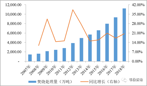 隨著城市生活垃圾“減量化、資源化、無(wú)害化”處理需求的日益增長(zhǎng),我國(guó)垃圾焚燒處理近年來(lái)發(fā)展迅速。據(jù)住房和城鄉(xiāng)建設(shè)部統(tǒng)計(jì):2007年至2018年,我國(guó)城市生活垃圾焚燒廠年實(shí)際處理量從1,446萬(wàn)噸增長(zhǎng)到11,226萬(wàn)噸,復(fù)合增長(zhǎng)率達(dá)20.48%。