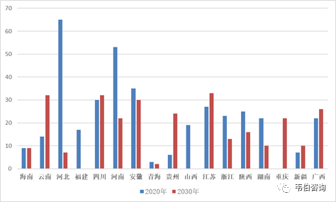 圖表14:截止2020年底和2030年底各省垃圾焚燒中長(zhǎng)期規(guī)劃新增項(xiàng)目數(shù)量(個(gè))