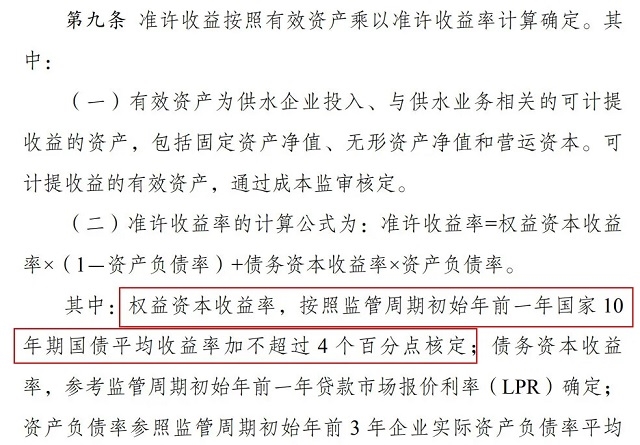 《管理辦法》規(guī)定,供水企業(yè)準(zhǔn)許收益率根據(jù)權(quán)益資本收益率、債務(wù)資本收益率確定,權(quán)益資本收益率按照10年期國債收益率加不超過4個百分點(diǎn)核定,債務(wù)資本收益率按照市場報價利率確定,有利于吸引社會資本進(jìn)入,促進(jìn)供水行業(yè)健康持續(xù)發(fā)展。