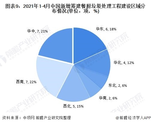 按區(qū)域分布來看,2021年1-4月,我國已披露的新增籌建的餐廚垃圾處理項(xiàng)目主要分布在華中地區(qū)和西南地區(qū),數(shù)量均為7項(xiàng),合計(jì)占比全國新增數(shù)量的43%。
