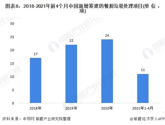 由于2020年疫情的特殊情況,僅比較2019年和2021年的情況來看,2021年1-4月,我國新增籌建的餐廚垃圾處理項(xiàng)目已經(jīng)有11項(xiàng),相當(dāng)于已達(dá)到2019年新增籌建項(xiàng)目的50%。