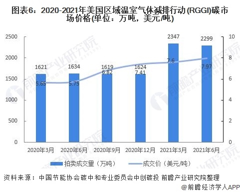 2020-2021年,美國RGGI碳市場價格呈上升趨勢。RGGI碳市場的初始配額發(fā)放以拍賣為主,每個季度舉行一次拍賣。2021年第一季度拍賣成交均價為$7.60美元,較上一季度漲幅為2.5%。由于弗吉尼亞州的加入,RGGI總成交量創(chuàng)歷史新高,達到了2347萬噸。2021年第二季度,美國RGGI拍賣成交均價為7.97美元,較上一季度漲幅為4.9%,總成交量為2299萬噸。