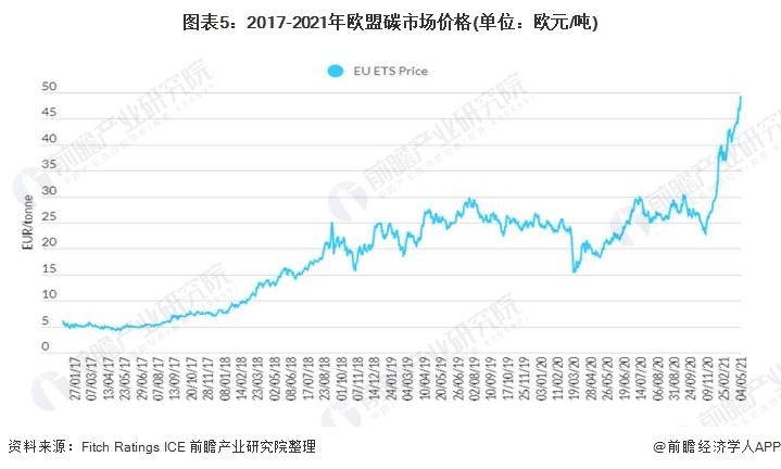 2019-2020年,由于歐盟排放交易體系規(guī)則的收緊預(yù)期以及碳免費配額的減少,ETS碳價格從平均每噸25歐元翻倍至2021年5月初的每噸50歐元左右。