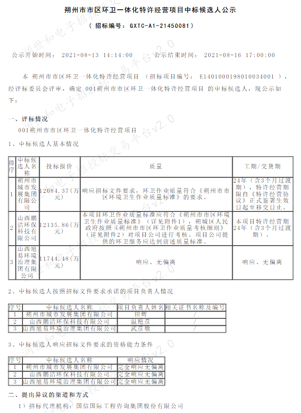 原標(biāo)題:朔州市市區(qū)環(huán)衛(wèi)一體化特許經(jīng)營項(xiàng)目中標(biāo)候選人公示