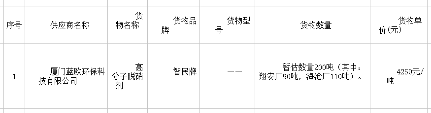 廈門公物-公開招標-GW2021-QY190C-高分子脫硝劑采購-中標候選人公示