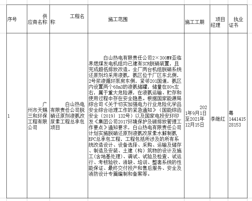 白山熱電有限責任公司脫硝還原劑液氨改尿素工程總承包項目中標結果公告