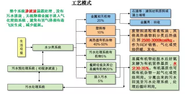 以自有研發(fā)的垃圾水分類技術為核心和前提,結合并優(yōu)化現(xiàn)有垃圾分類方法、資源再生技術的垃圾處理方法,整個系統(tǒng)滲濾液前置處理,沒有污水排放,無機物和金屬不進入氣化焚燒系統(tǒng),避免有害氣體和有毒飛灰生成,減少能耗。以其恩施項目為典型案例,對其具有自主專利的垃圾水分類技術進行了全面的介紹,具有綜合利用率80%以上,無二次污染,清洗水全部經處理回用,氣化燃氣和煙氣排放達標無隱患等技術特點。