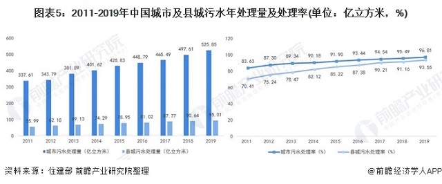 圖表5:2011-2019年中國城市及縣城污水年處理量及處理率(單位:億立方米,%)